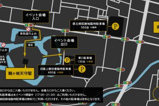 駐車場 | 来場者の安全確保のため、イベント会場へは指定入口(北出丸)からのみご入場ください。 10月3日~5日の17時~21時30分は、西出丸駐車場には駐車できません。 お車でお越しの方は、東口駐車場または臨時駐車場をご利用ください。 県立病院跡地臨時駐車場は無料でご利用いただけます。その他の駐車場は有料です。 |