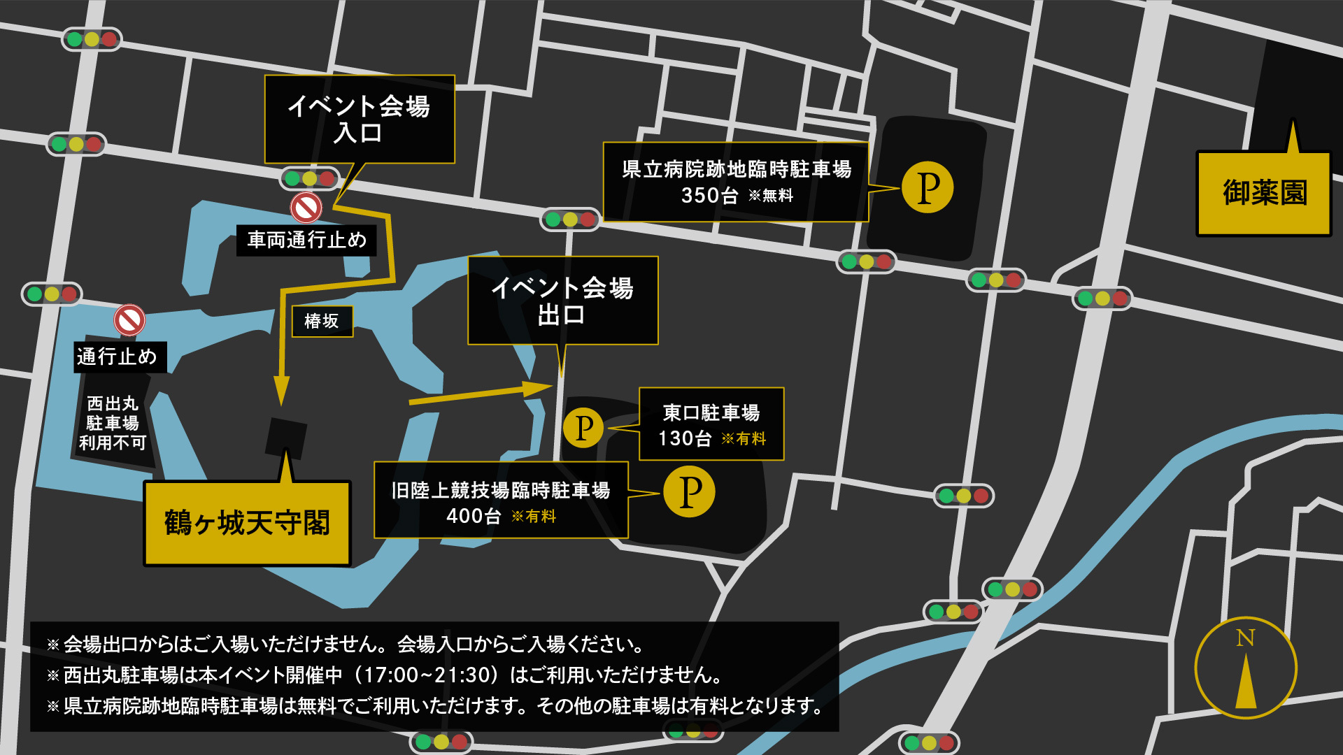 | 駐車場 | 来場者の安全確保のため、イベント会場へは指定入口(北出丸)からのみご入場ください。 10月3日~5日の17時~21時30分は、西出丸駐車場には駐車できません。 お車でお越しの方は、東口駐車場または臨時駐車場をご利用ください。 県立病院跡地臨時駐車場は無料でご利用いただけます。その他の駐車場は有料です。 |