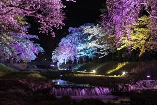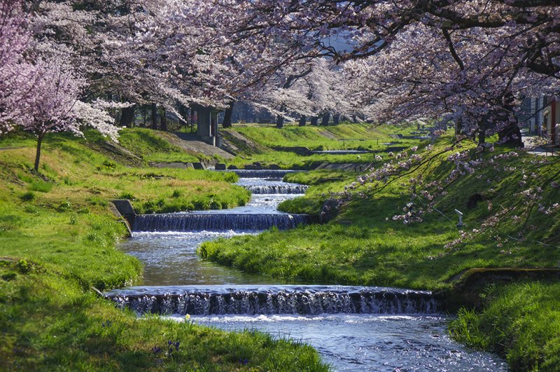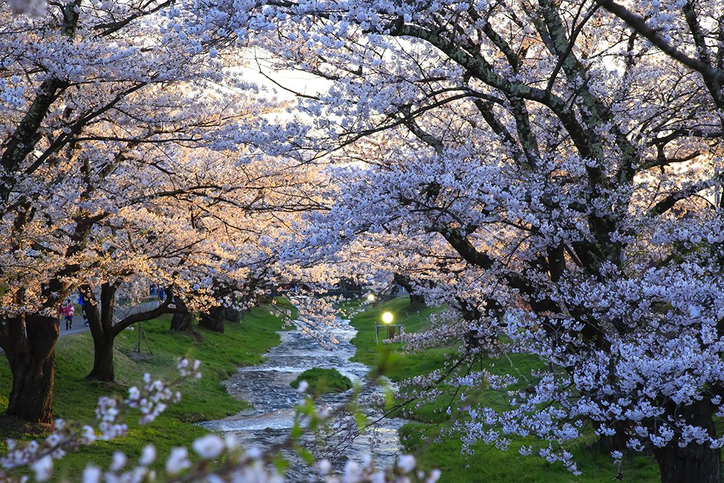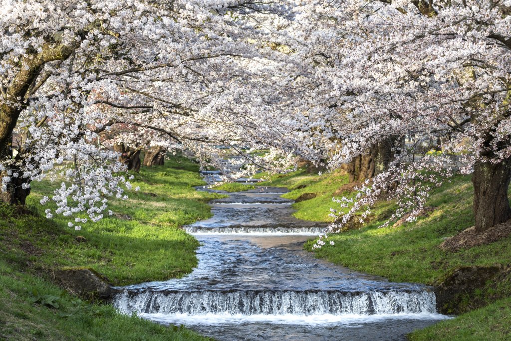 清らかな流れに寄り添うように咲く桜は、川面に映る姿も美しく、歩くだけで心がほどける春の絶景。昼はやわらかな日差しの中での散策、夜はライトアップによる幻想的な雰囲気が楽しめます。水の音とともにゆったりと花見ができ、穏やかな春のひとときをお過ごしください。