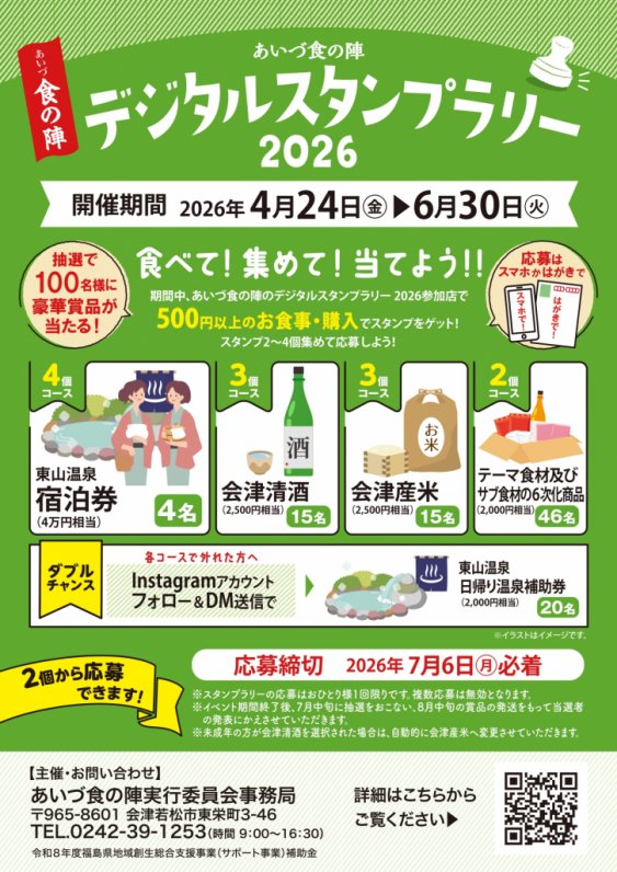 ■対象店舗:45店舗(詳細はあいづ食の陣デジタルスタンプラリー特設ページをご覧ください。)