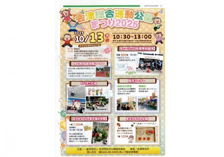 都市公園で楽しいイベント盛りだくさん!みんなで参加しよう!! 「会津総合運動公園まつり」が、会津総合運動公園あいづ陸上競技場正面広場で開催されます。 球根の無料配布、子供の遊戯コーナーや模擬店コーナーなど秋の一日を楽しく過ごして頂くための企画を用意してお待ちしております。 ツイート エリア 中心市街地エリア(会津若松駅・鶴ヶ城) カテゴリ 花火・祭り 秋のオススメ(9月~11月) 体験 イベント開催期間 2025年10月13日(月・祝) イベント開催場所 会津総合運動公園(会津若松市門田町大字御山字村上164) イベント会場名 会津総合運動公園あいづ陸上競技場正面広場 開催時間 10:30~13:00 住所 福島県会津若松市 電話番号 0242-28-4440(会津若松市公園緑地協会) 公式WEBサイト 周辺情報を表示する 観光・体験 グルメ お土産 イベント 宿泊 Google Mapの読み込みが1日の上限を超えた場合、正しく表示されない場合がございますので、ご了承ください。