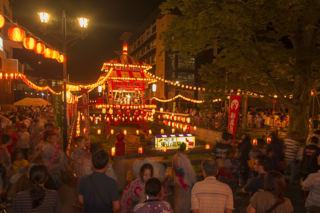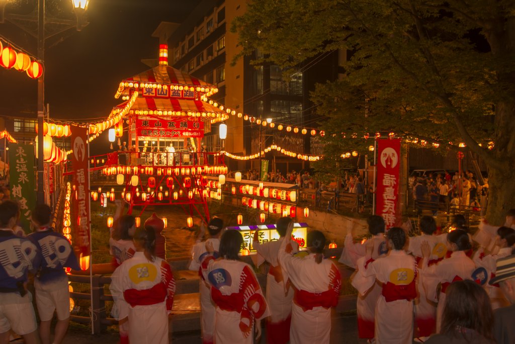 東山温泉を流れる湯川の清流の上に組まれた櫓の周りを、民謡「会津磐梯山」の唄とお囃子に合わせて、市民や温泉客が一緒になって盆踊りを楽しみます。東山温泉の女将や芸者衆も踊りのお手本になって踊りますので、初めての方でもすぐに踊りの輪に参加いただけます。