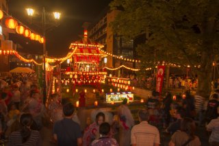櫓から四方に伸びた提灯や櫓周りを飾る提灯など、およそ1,000個の提灯に明かりが入るとそれは壮観な眺めです。櫓の周辺には、食べ物のブースや昔懐かしい露天が軒を並べます。