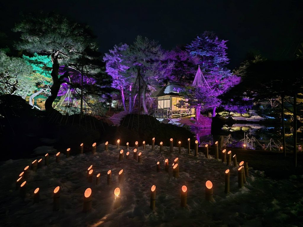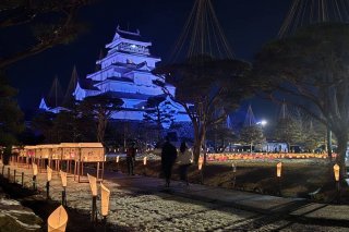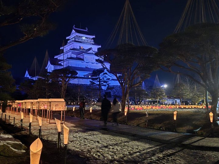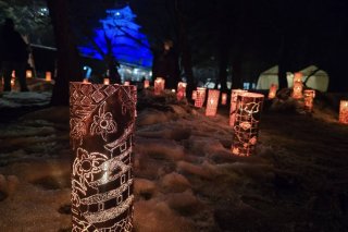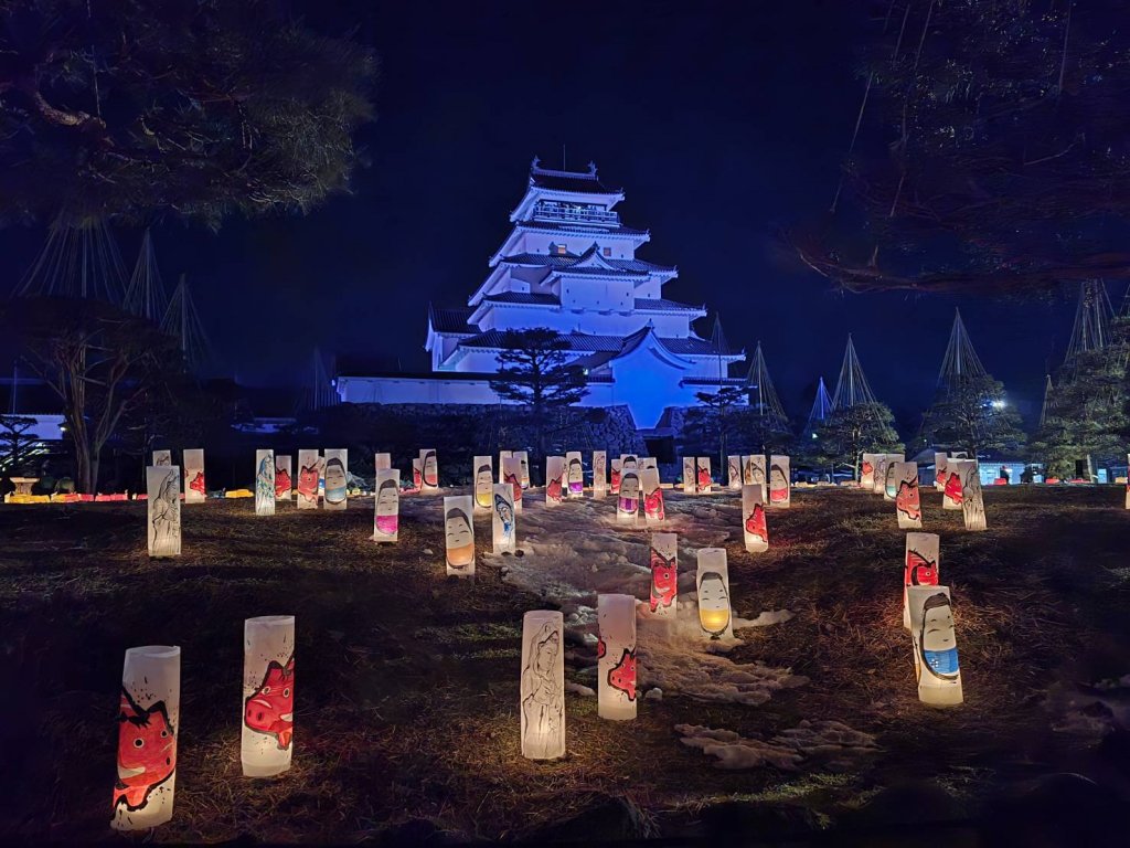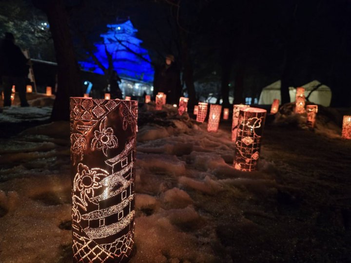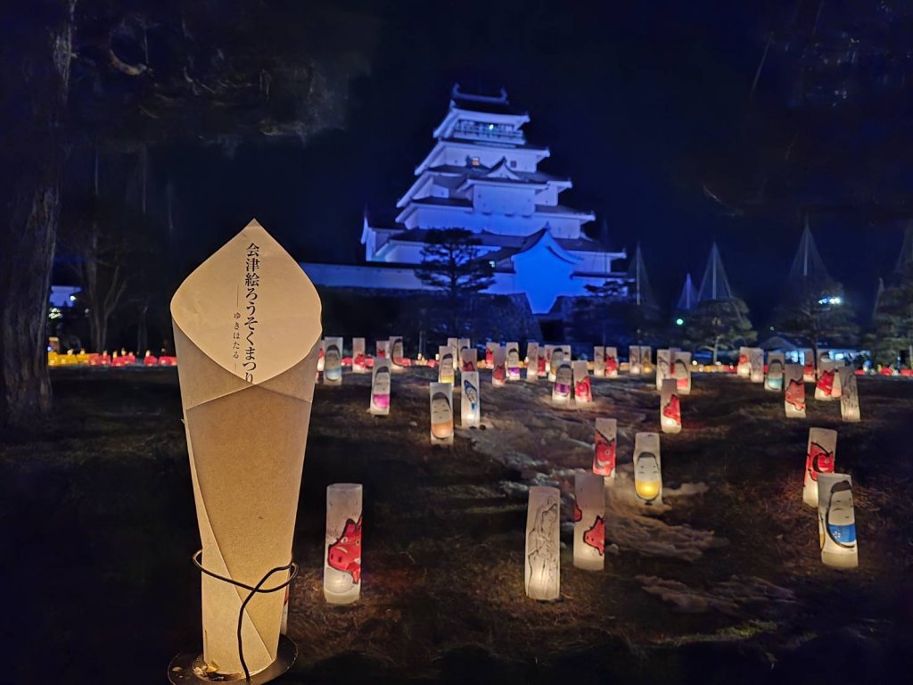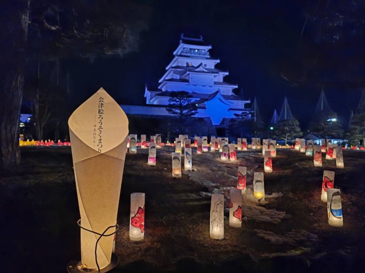 鶴ヶ城や御薬園をはじめ市内各所にて「約10,000本の蝋燭のあかりに照らされて雪景色に浮かぶ会津幻影」をお楽しみください。