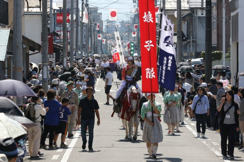 厳かに行われる先人感謝祭のあと、いよいよ会津まつり最大のイベント「会津藩公行列」の幕が開きます。 「会津藩公行列」は総勢約500名で構成され、武者姿で練り歩きます。 鶴ヶ城本丸にて出陣式が行われ、行列はまちなかへ出発します。各所では奴隊による毛槍による所作も披露され、沿道を埋め尽くす観客の声援の中、祭りはクライマックスを迎えます。