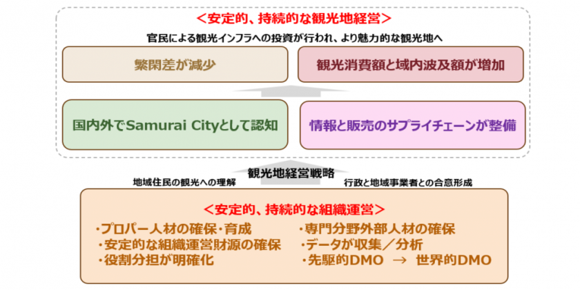 DMOとは、地域の「稼ぐ力」を引き出すとともに、地域への誇りと愛着を醸成する「観光地経営」の視点に立った観光地域づくりの舵取り役として、多様な関係者と協同しながら、明確なコンセプトに基づいた観光地域づくりを実現するための戦略を策定するとともに、戦略を着実に実施するための調整機能を備えた法人です。