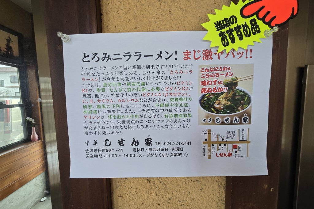 会津若松で親しまれる「しせん家」の名物は、ニラをたっぷり使ったとろみニララーメン。