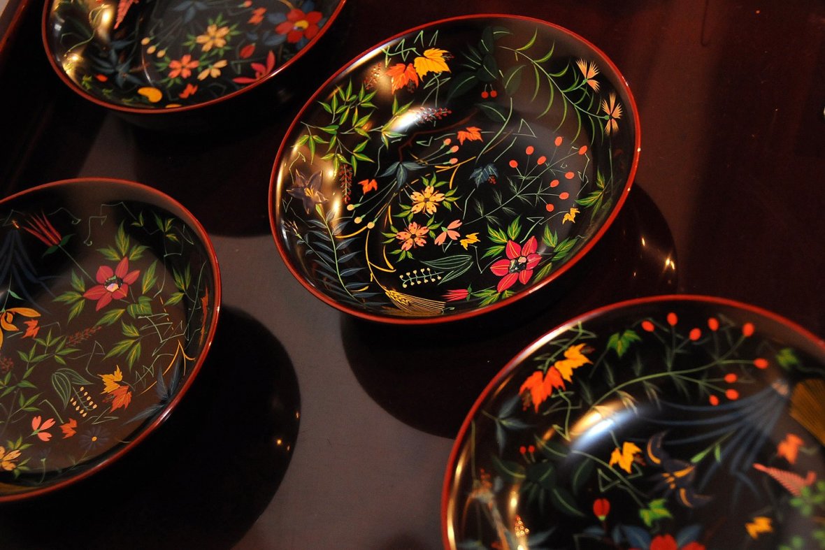 「蒔絵師」とは漆器などに絵や文様などを描き、装飾する職人のこと。その職人が手仕事をする「御蒔絵 やまうち」は趣のある蔵の中に工房とギャラリーがあります。漆器作りに重要な湿気や温度が一定に保ちやすいため、このような場所での仕事にこだわっています。工房では伝統の技法にこだわり、ひとつひとつが手作り。品物はすべて木製・本漆・手塗り・手描きで仕上げているのが特長です。こういった職人の工房は見学できないイメージが強いですが、ここは見学もOK。ギャラリーの展示品も説明を受けるとまたひと味違って見えてくるから不思議です。