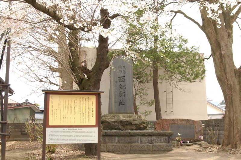 西郷頼母邸跡が鶴ヶ城正面の追手町にあります。西郷家は重臣(藩祖以来)で戊辰戦争の際の当主は国家老1700石の西郷頼母近悳(ちかのり)でした。頼母は田中土佐と共に会津藩主松平容保(かたもり)に京都守護職辞退を進言しました。そのため容保から怒りを買い、家老職を解任されました。戊辰戦争がおこると、家老職に復帰し白河口総督として、戦いますが「白河口の戦い」で敗れ、会津へ戻ります。その後、長男・吉十郎を連れて会津から出ます。新政府軍が城下町に乱入したとき、家族ら21人は、邸宅で辞世の句を残して自決しました。妻・千重子の辞世の歌「なよたけの碑」は墓とともに市内善龍寺にあります。