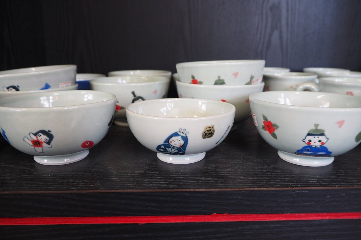 窯独自の藍呉須と釉薬を使用。幾何学模様や草花などすべて手描きです。店内にて日用使いの製品が数百種類並びます。